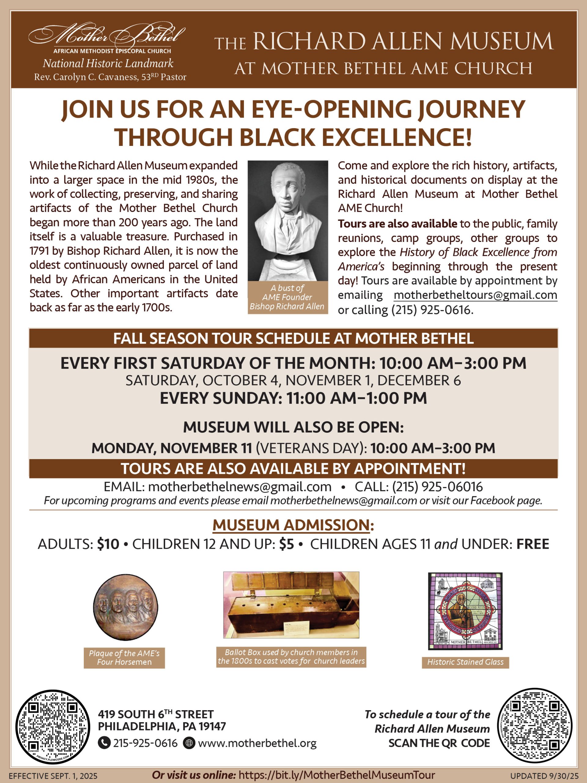 Come and explore the rich history, artifacts, and historical documents on display at the Richard Allen Museum at Mother Bethel AME Church. Tours are open to the public, family reunions, camp groups, other groups to explore the history of Black Excellence from America’s beginning through the present day!